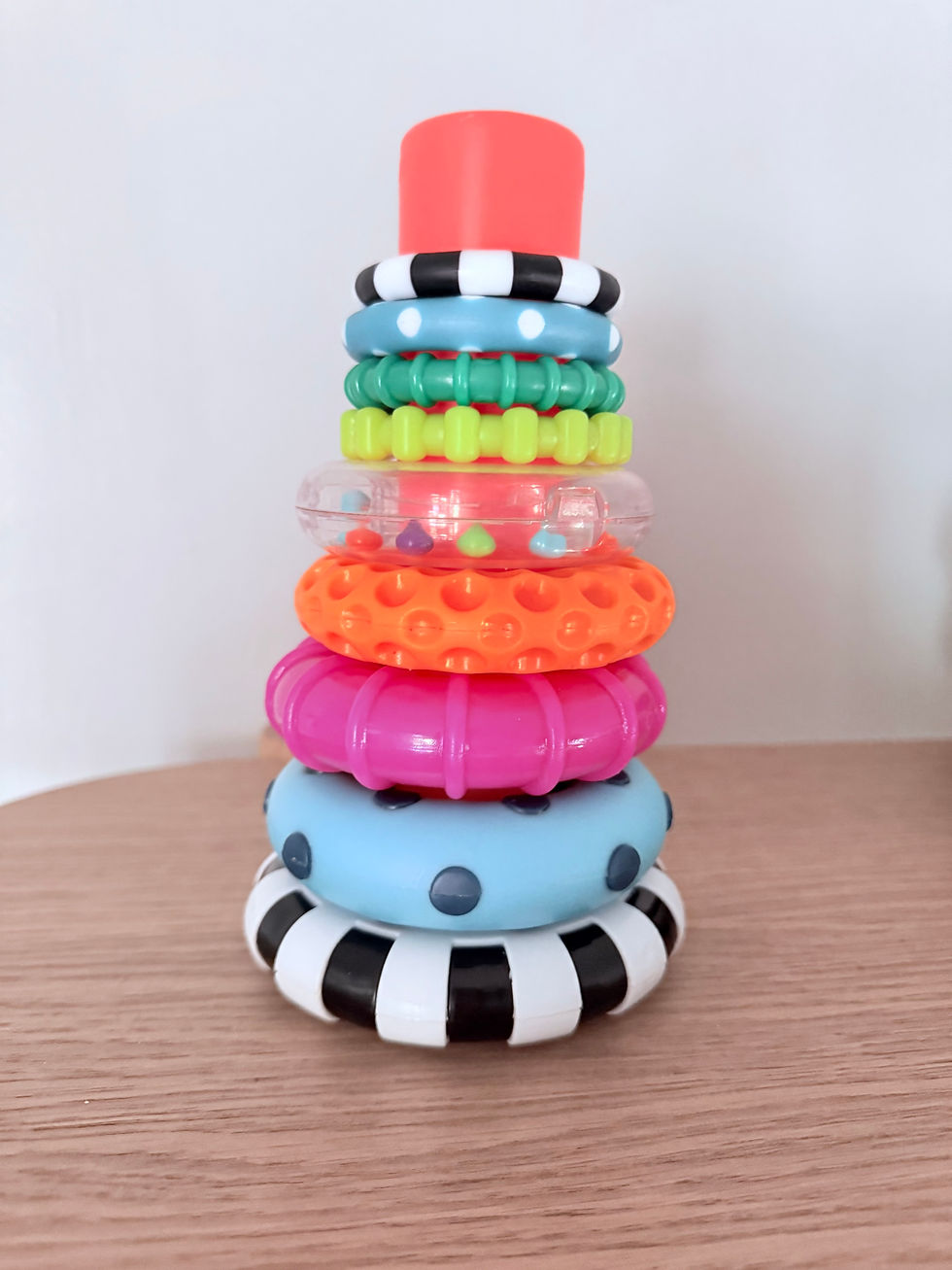 Babies love trying to grip the rings, shake them, mouth them, and eventually try to pull them off the pole. Many versions now include different textures, materials, and even rattles inside some of the rings for extra sensory feedback. The one pictured you can find here, but there are many others available, including rocking styles, silicone options for teething relief, and soft fabric designs.
